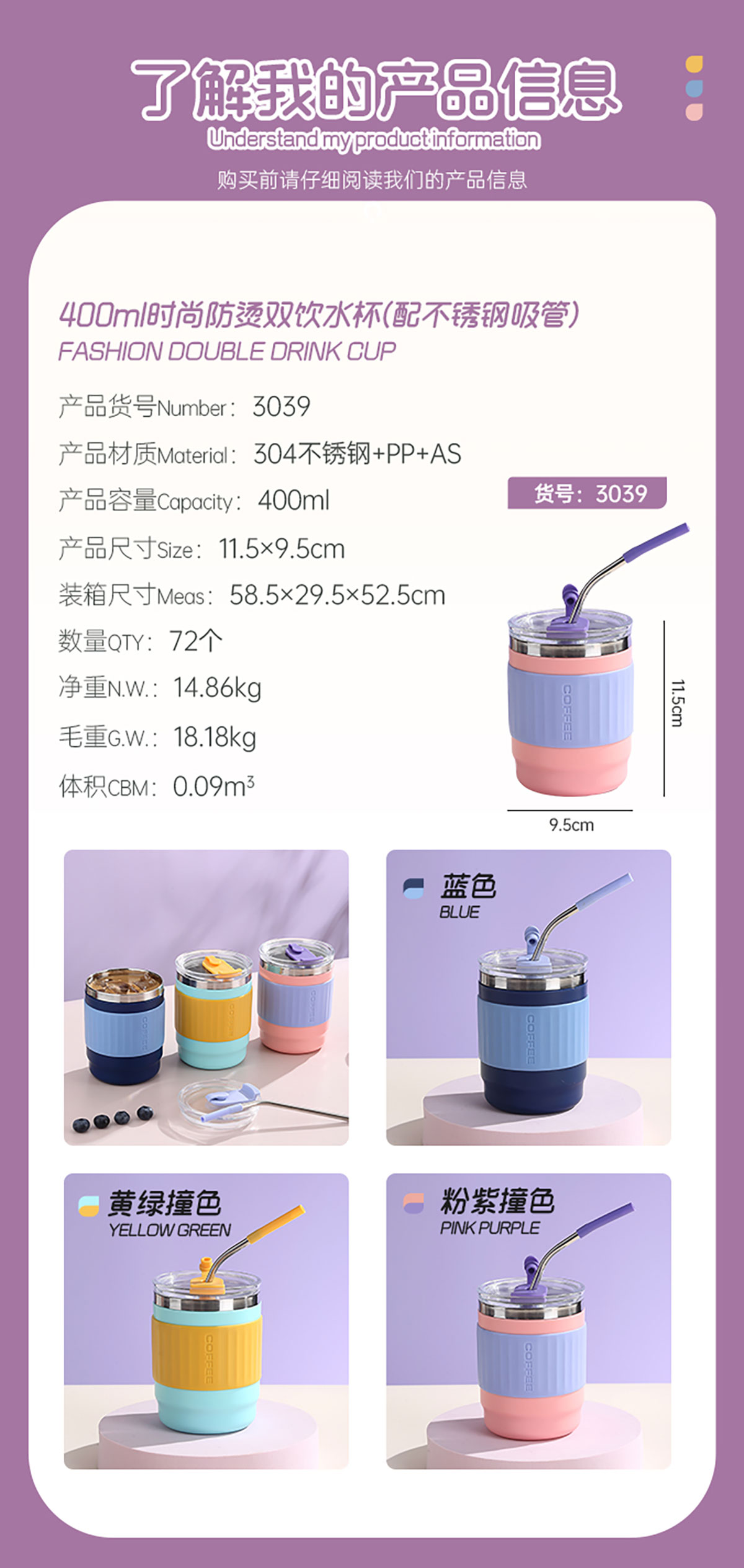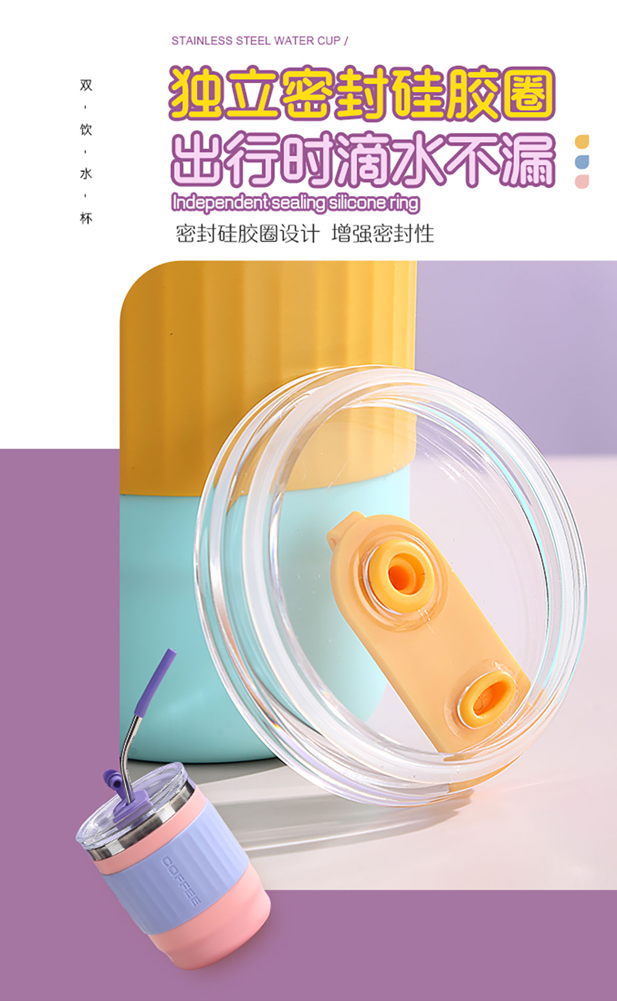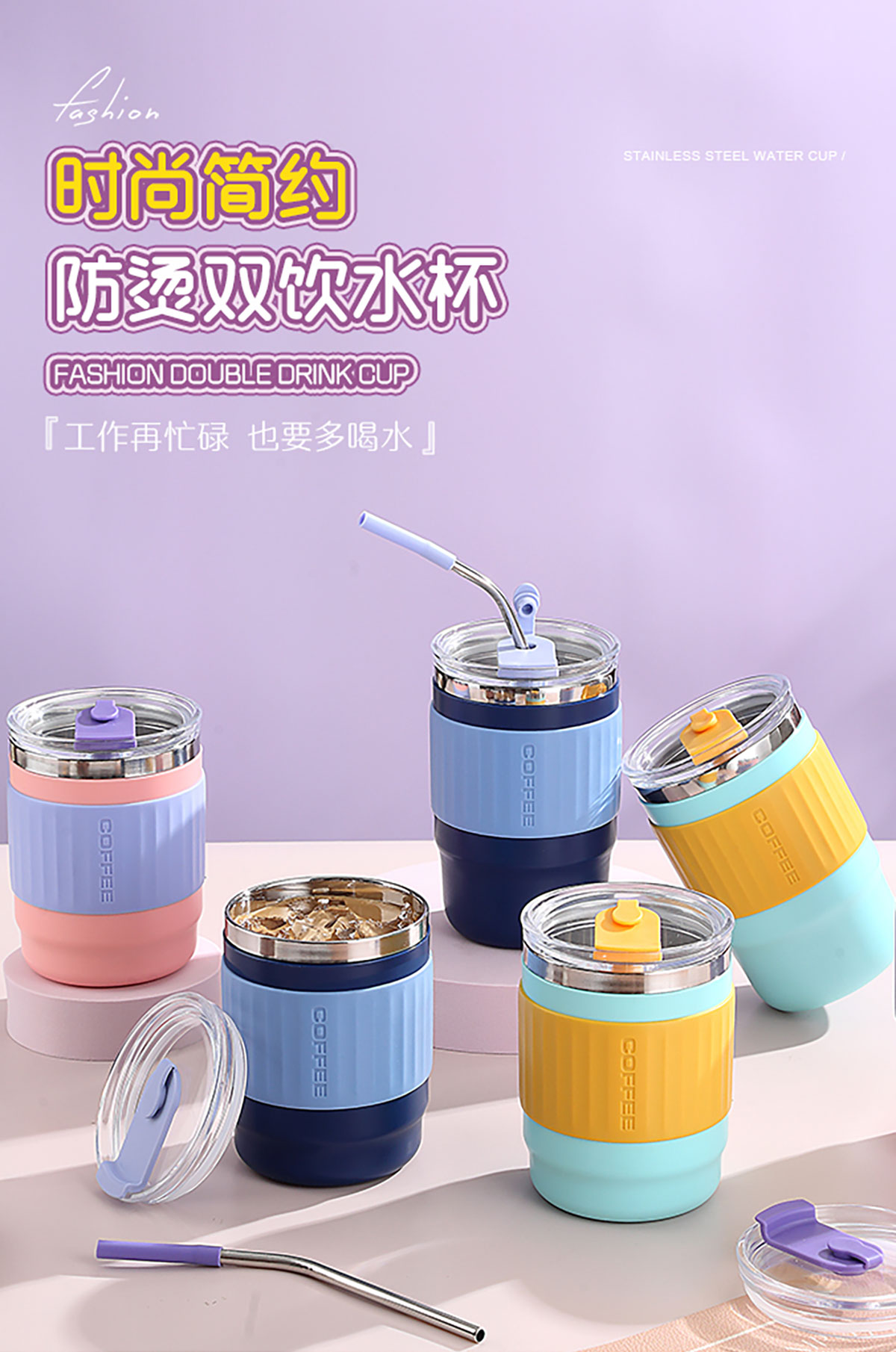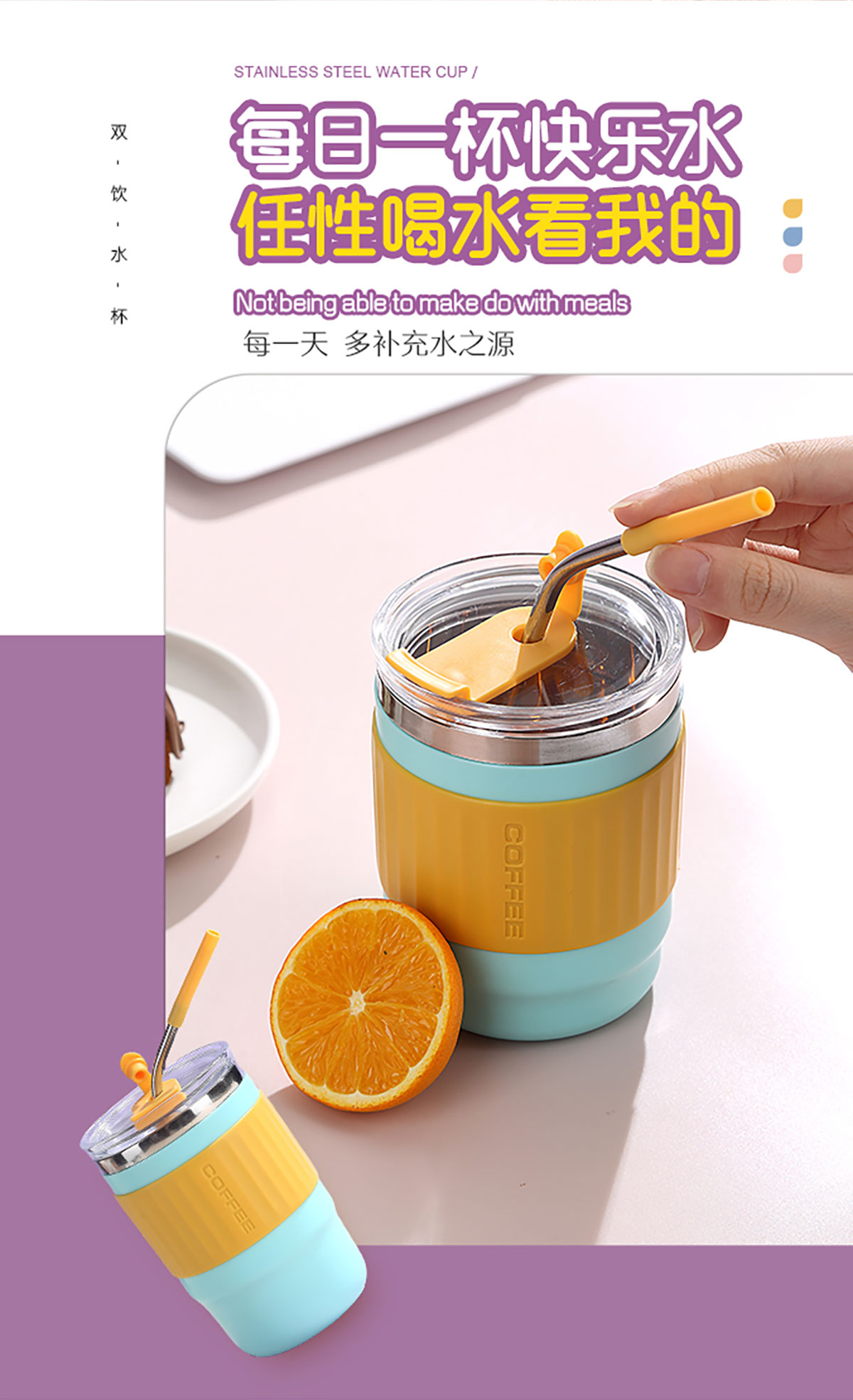 400ml/500ml時(shí)尚防燙雙飲水杯(配不銹鋼吸管)