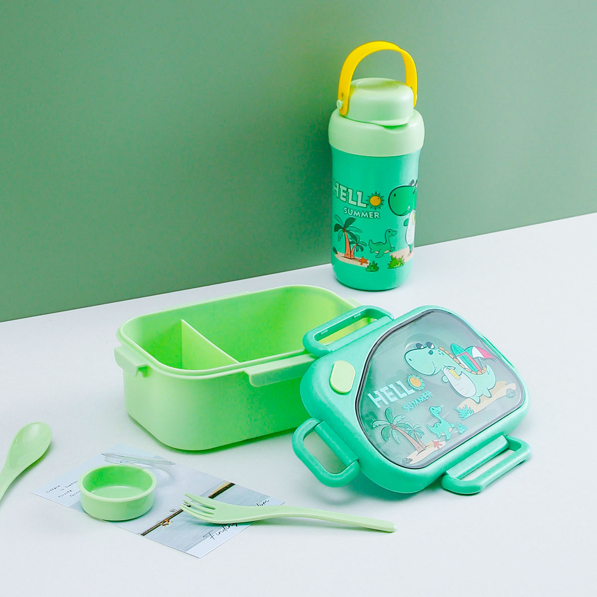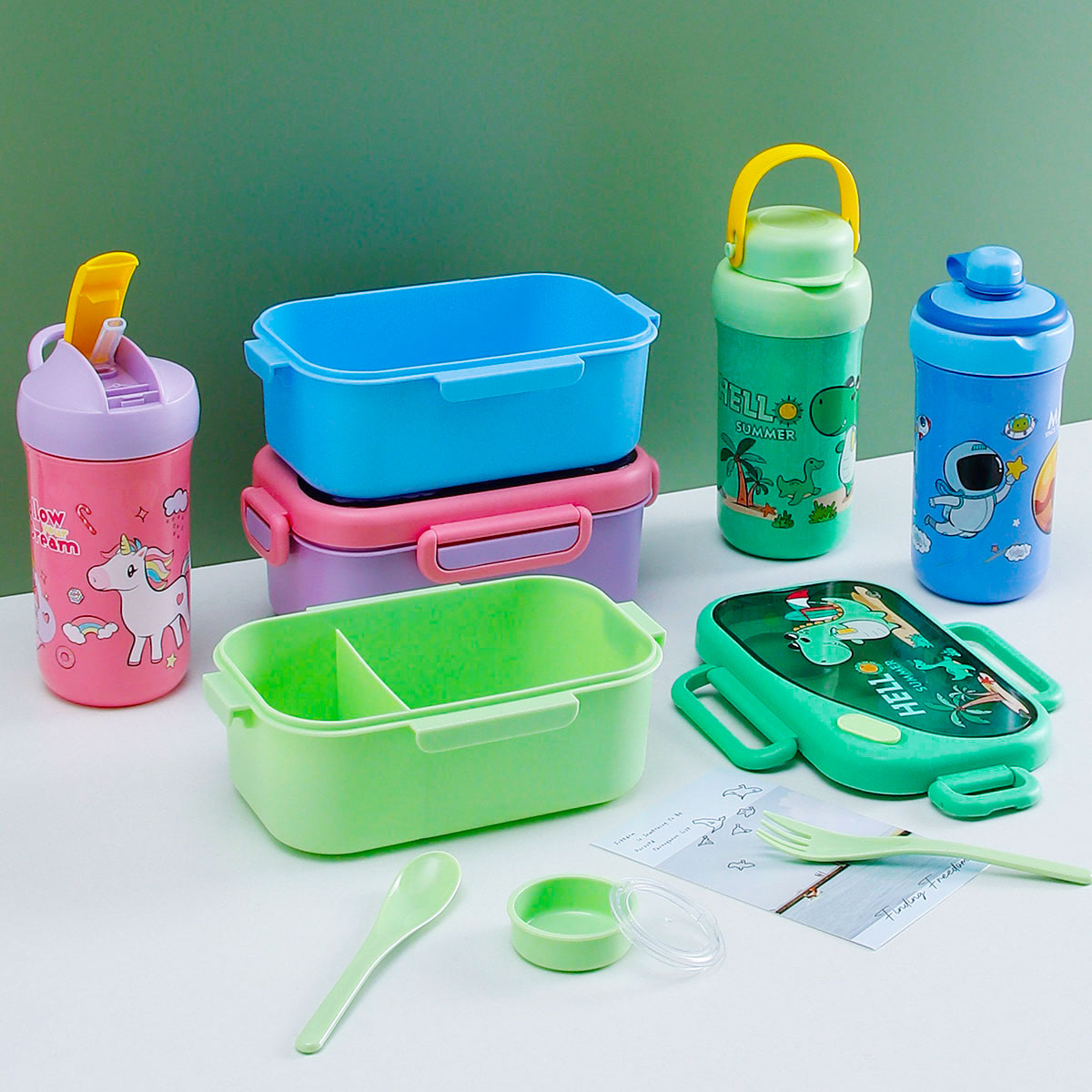 趣悅卡通長方單層/分格飯盒(含調料盒)+翻蓋吸嘴/旋蓋運動/翻蓋運動水壺