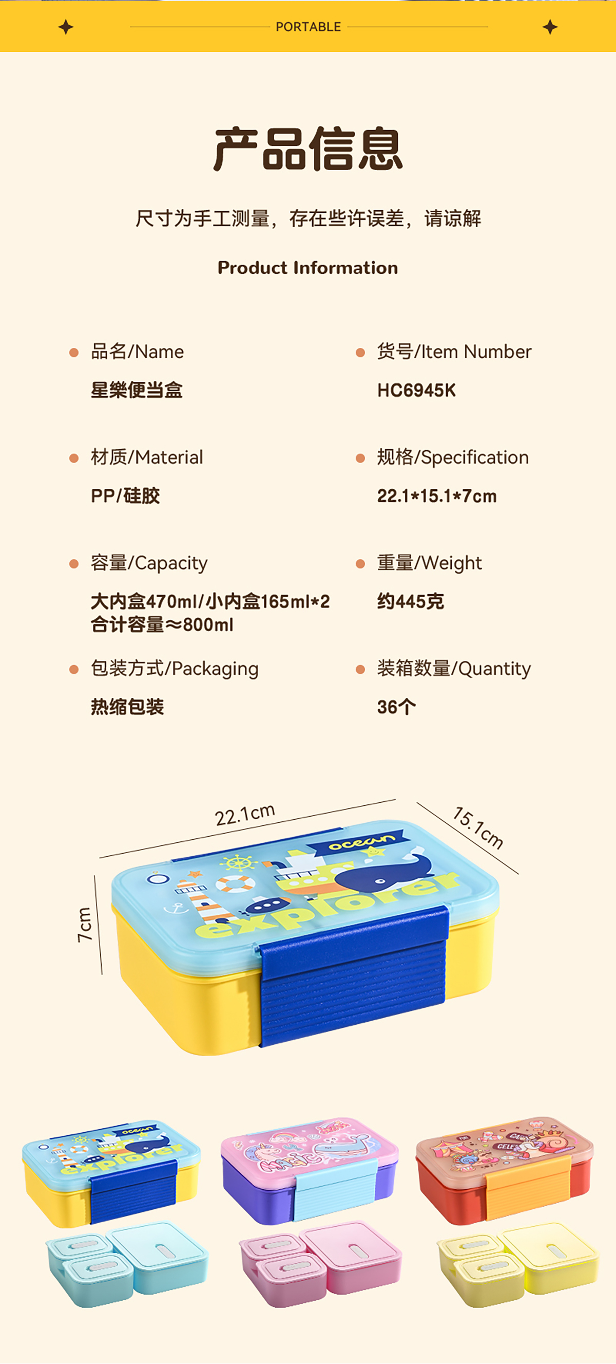 Size: 221*151*70mm/大內(nèi)盒470ml/小內(nèi)盒165ml*2